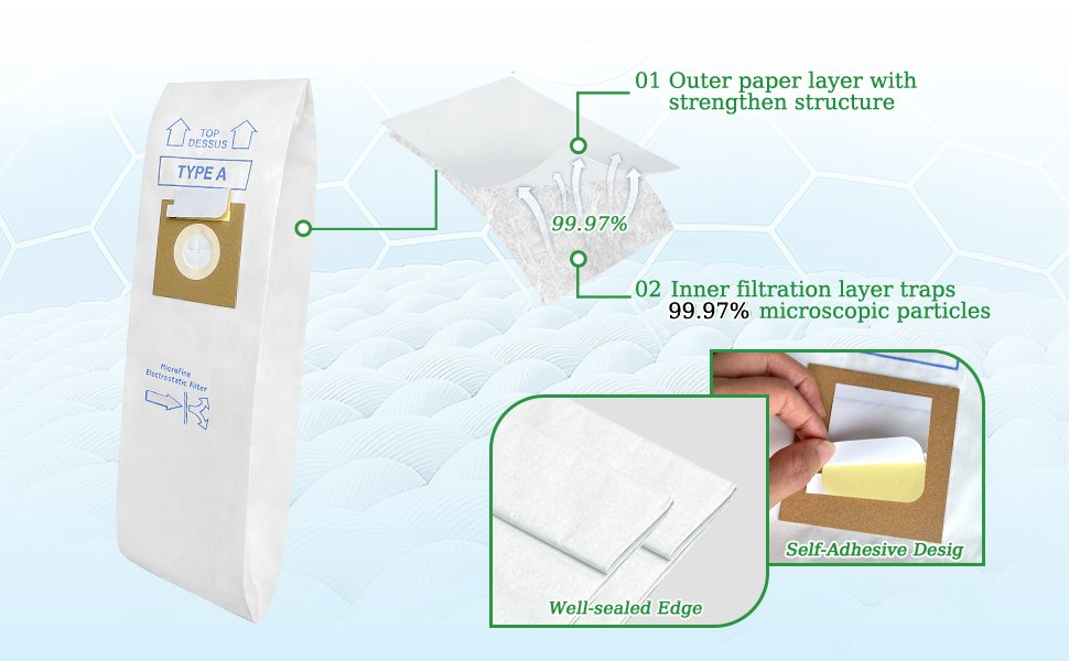 • : 12 Pack Type A vacuum bags replacement for hoover vacuum cleaners. A convenient and cost-effective solution to keep your vacuum performing at its best over an extended period.