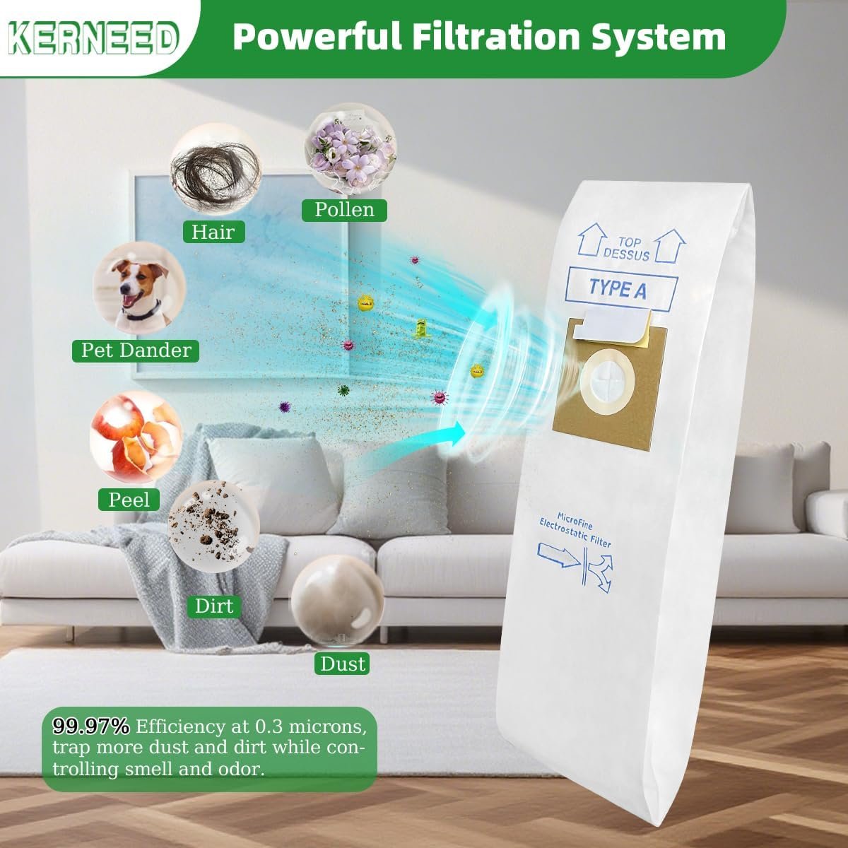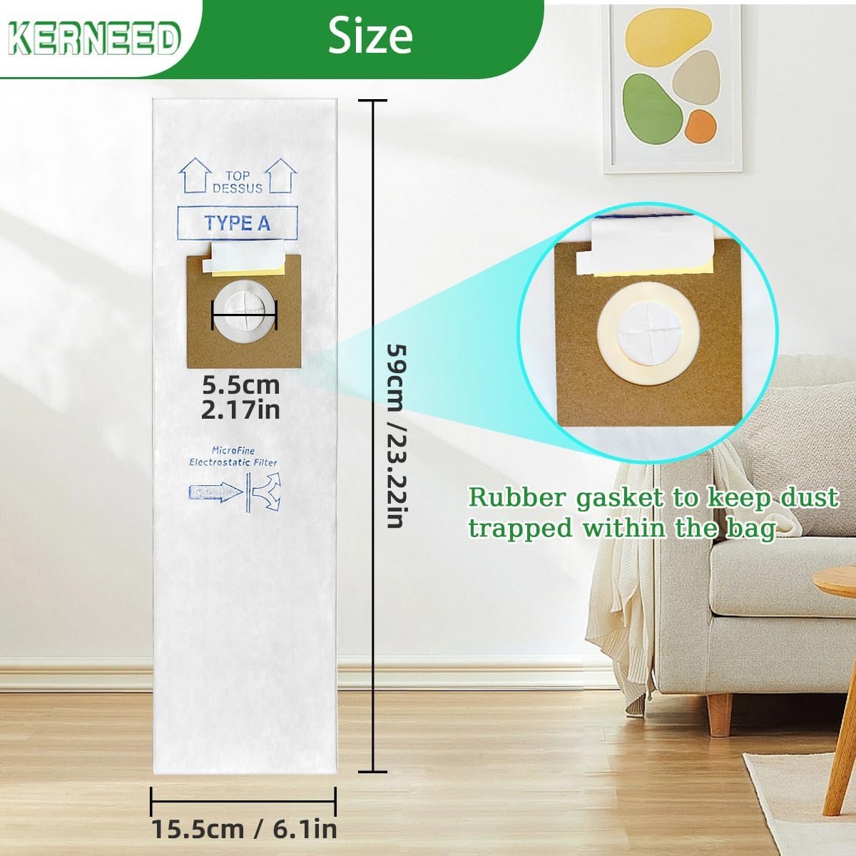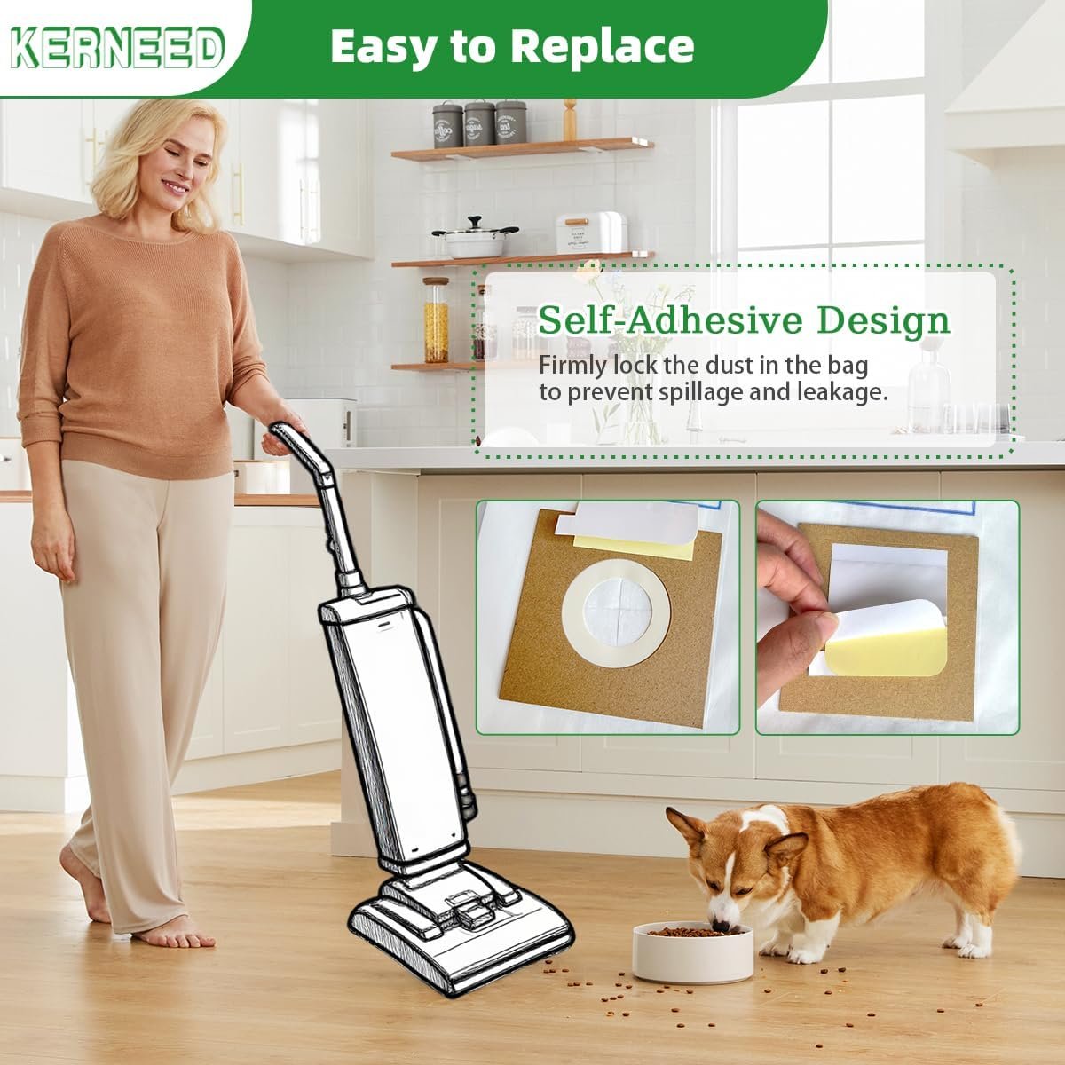 • : Adopts premium double-pleated laminated inner linings. Sturdy and thick enough for the long-term use and not easy to get leak or burst when vacuuming. Self-adhesive design effectively prevent overflowing while dumping.