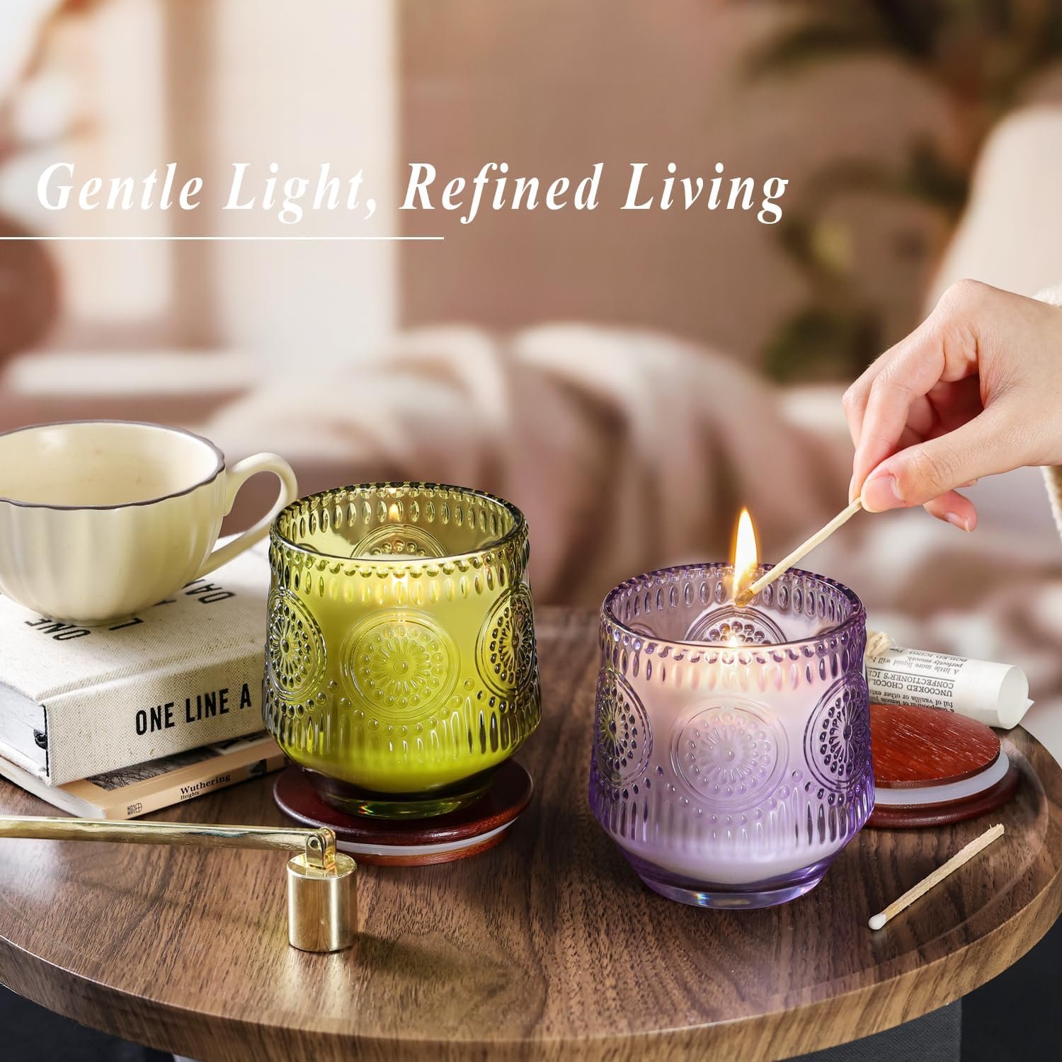 - 【Elegant Appearance】Housed in beautifully embossed glass jars with wooden lids, these jar candles double as stylish home décor. The soft green and gentle purple tones complement modern, minimalist, and natural home decor styles.
