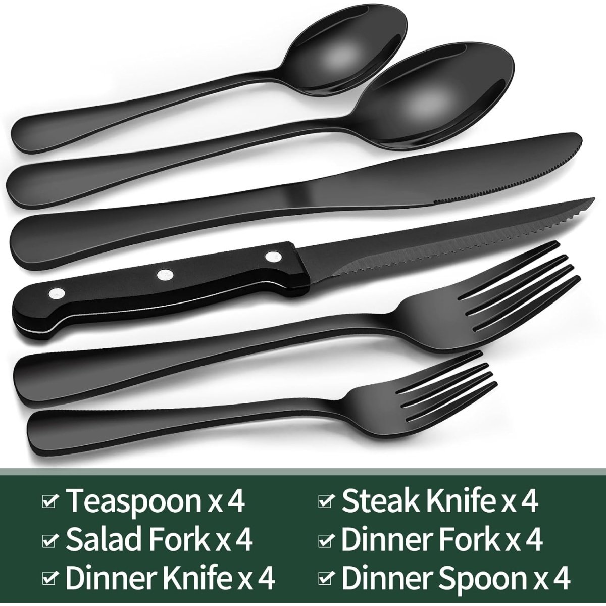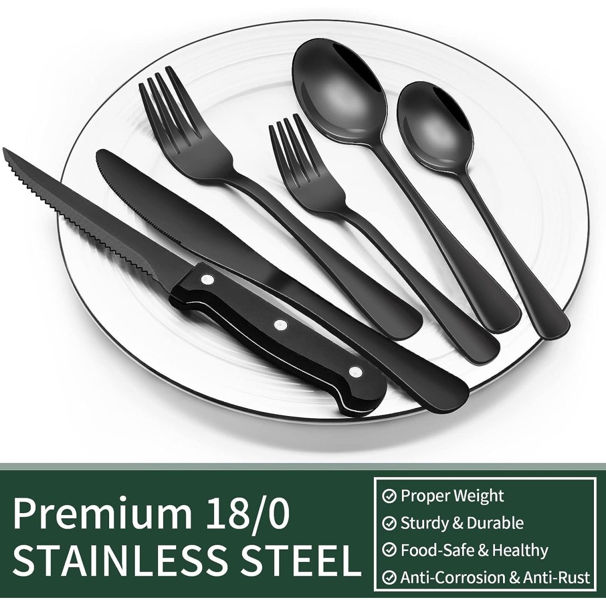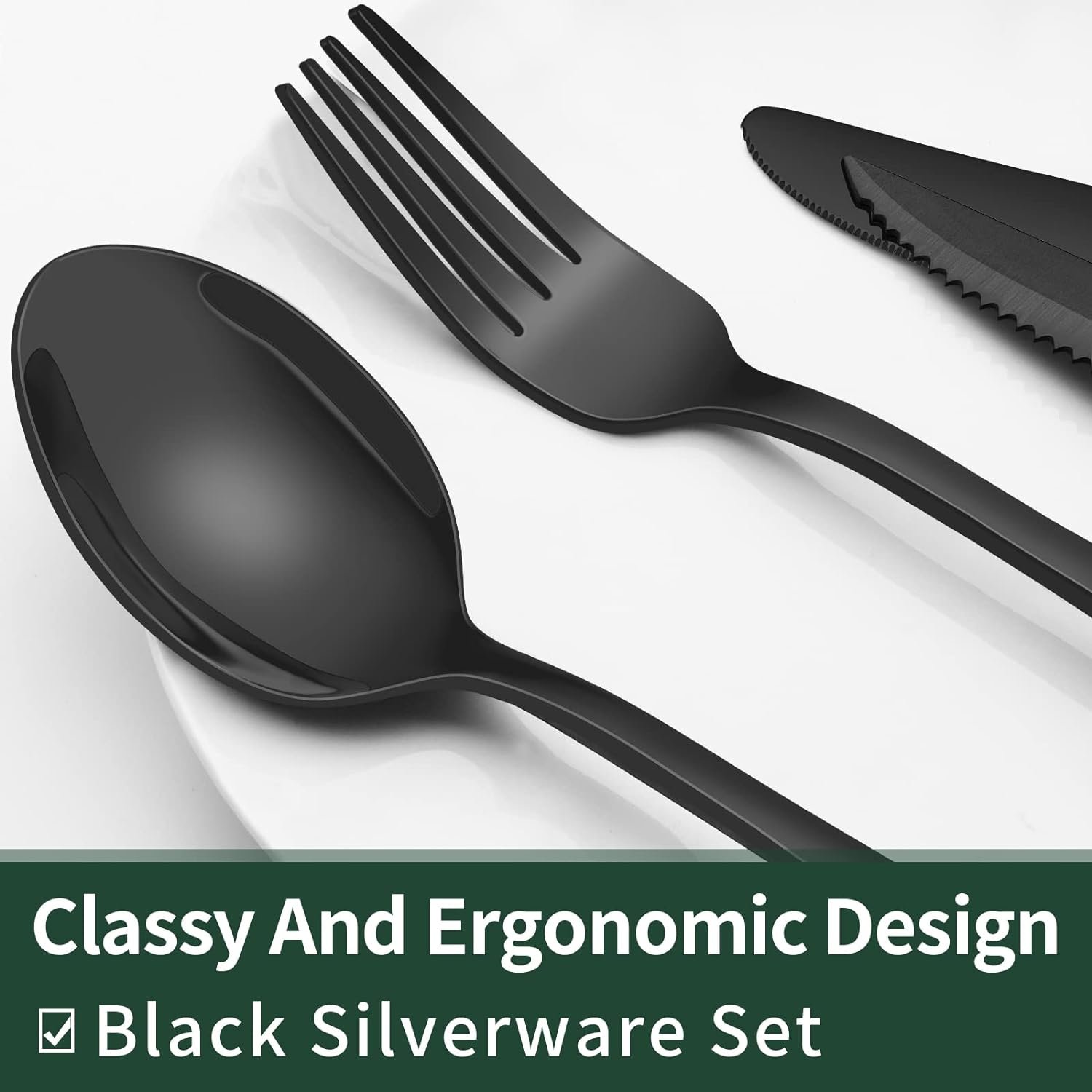 COMFORTABLE DESIGN: This flatware set has a classic silhouette with clean lines and polish-finish surface in all black, a good choice to go with your existing tableware. The smooth edge of the handle is pleasure to hold, appropriate weight and perfect balance are added to ensure maximum comfort during use.