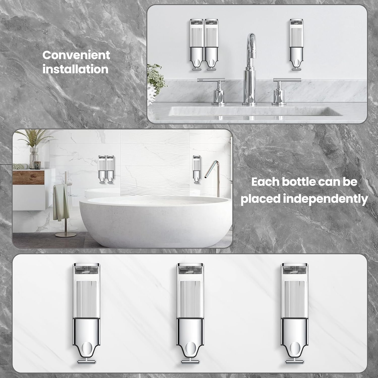 LARGR CAPACITY & ENVIRONMENT SAVING: Carry with 18.5 oz. big mouth refillable bottle which can be took out from the soap dispenser, easy to pour soap. The bottom of bath soap dispenser is equipped with an outlet liquid nozzle for separation, which can effectively guide the direction of liquid outflow. The push-type working principle makes commercial soap dispenser very easy to control the amount of liquid dispensed, can avoid leakage and waste.