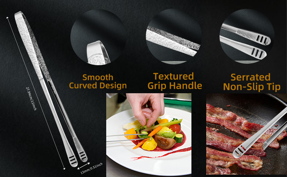 - Design features: 11-inch long-handled tongs with a patterned handle for non-slip grip, aesthetic appeal, and easy operation, protecting hands while handling small items.