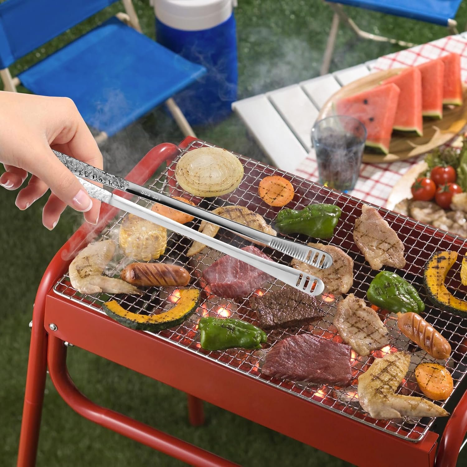 - Design features: 11-inch long-handled tongs with a patterned handle for non-slip grip, aesthetic appeal, and easy operation, protecting hands while handling small items.