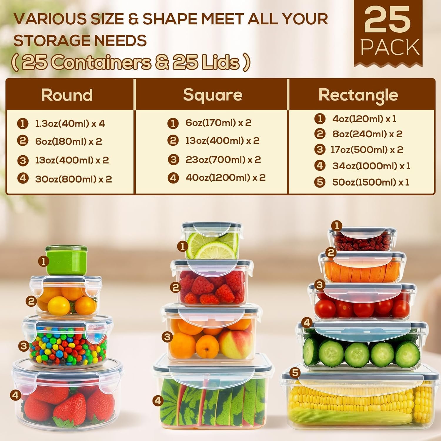 - Food Storage Solution: Our 50-piece set includes 25 clear food storage containers and 25 matching lids in a range of sizes and shapes—ideal for organizing meal prep, leftovers, salad, snacks, fruits, vegetable, sauces, and more. Whether you’re packing lunch or storing meals, these food storage containers with lids fit every kitchen need