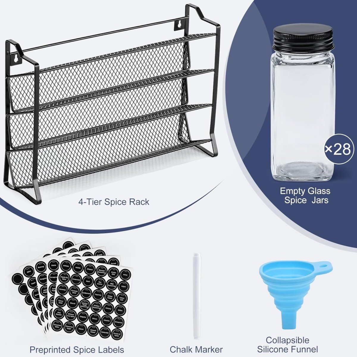 Organized and Accessible: The spice rack’s 4-tier design and quick-find labels make it easy to view and access all your spices, helping to effectively sort and organize your spice collection and reducing time spent searching for the right one during cooking.