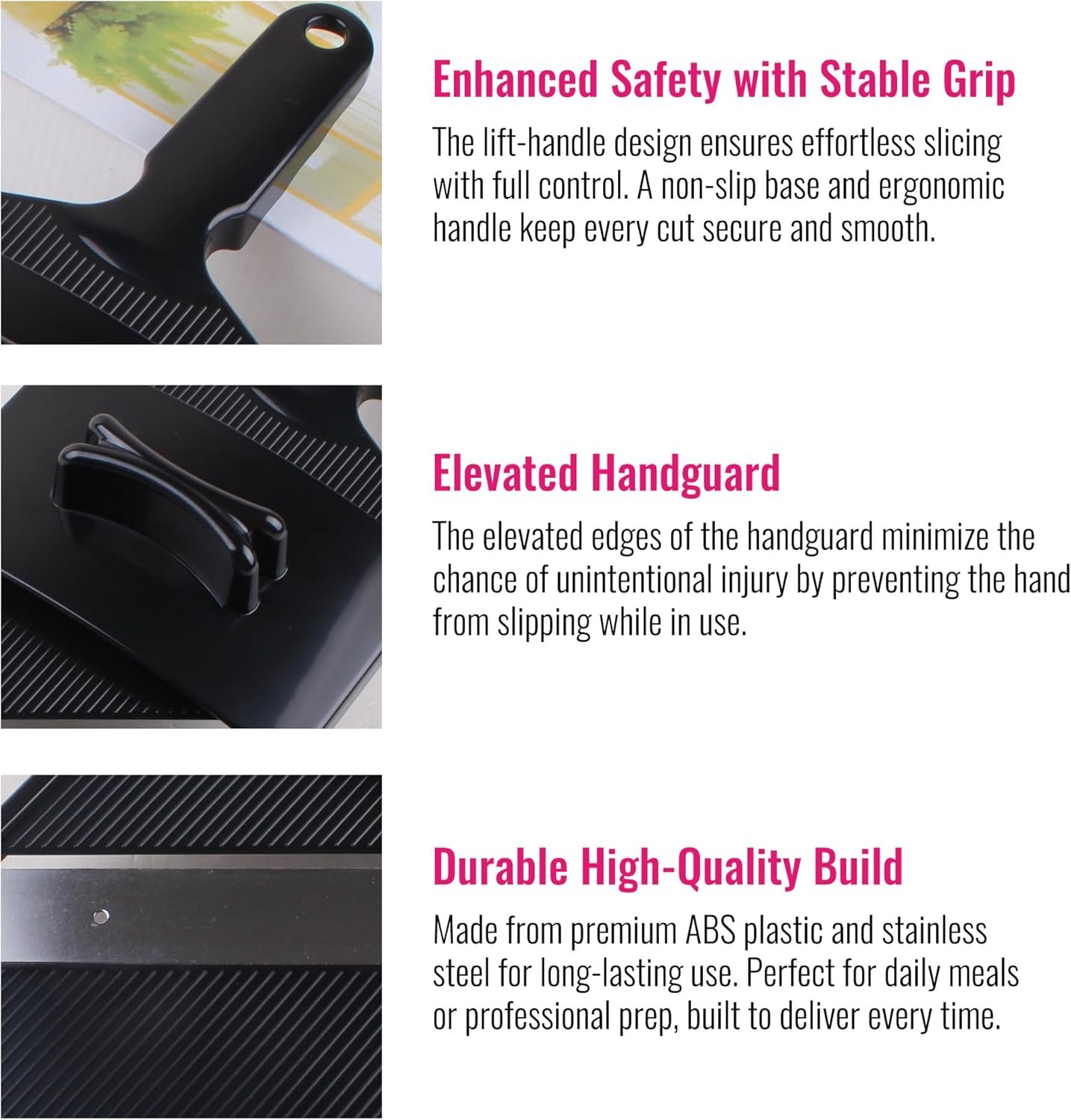 - Enhanced Safety with Stable Grip and Unique Handle Design: The lift-handle mechanism offers effortless manual slicing with a push-pull motion, giving you full control. A sturdy non-slip base and ergonomic handle ensure stability for safe, precise small cuts. With sharp blades and non-slip features, this cabbage slicer provides a smooth, secure slicing experience every time. Turn those jumbo cabbages into mini thin slices!