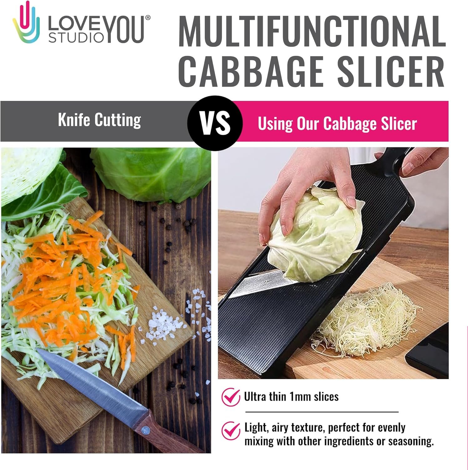 - Time-Saving and Multifunctional Japanese-style Slicer: Achieve ultra-thin 1mm slices effortlessly with LOVE YOU Studio’s Japanese-style cabbage slicer, perfect for shredded cabbage, plantain chips, and more. This multipurpose slicer handles vegetables, hard fruits, cheese, chocolate, and beyond, delivering professional-grade results quickly. Save time and enhance prep efficiency with a slicer designed for precision and ease.