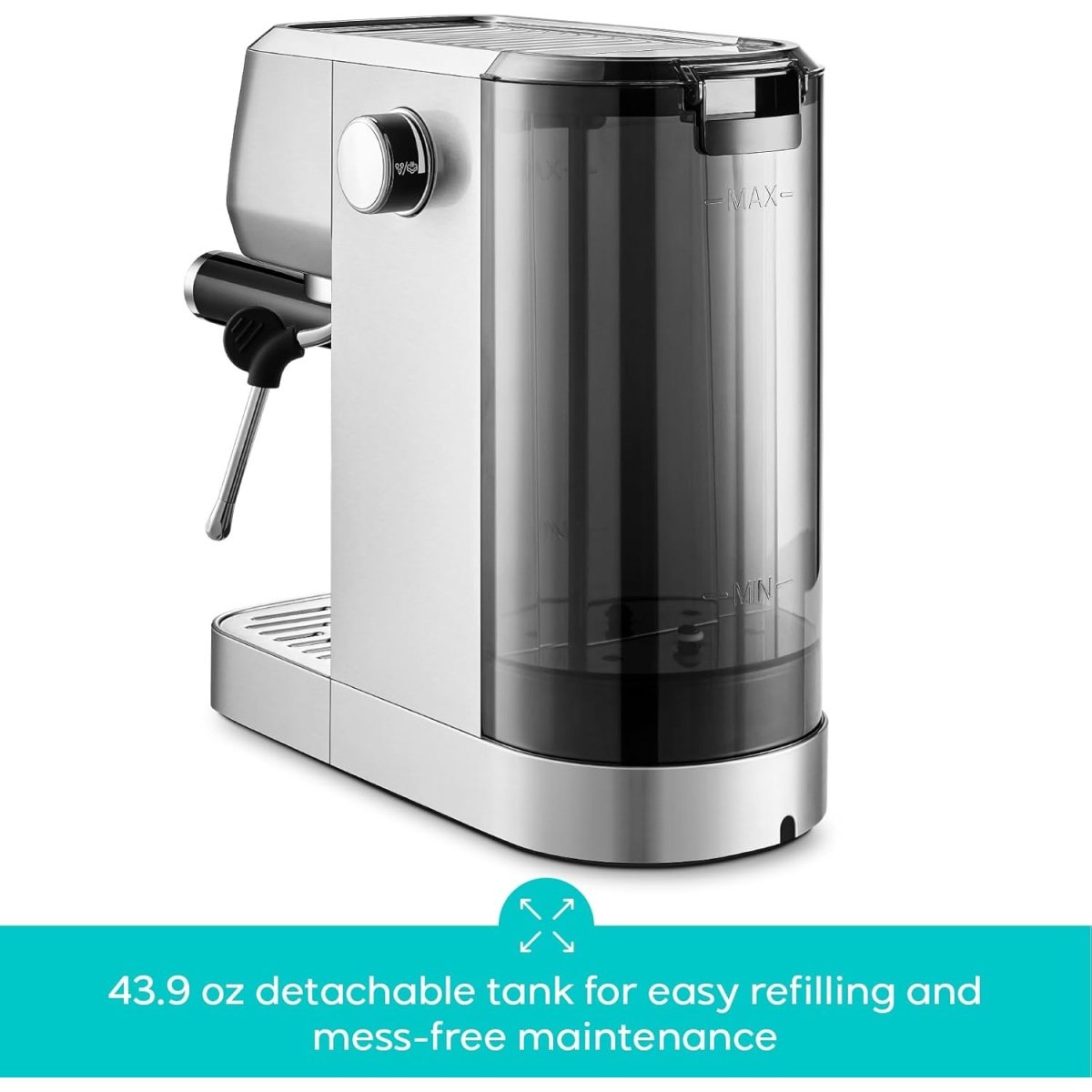 Compact & User Friendly: The compact espresso coffee maker only takes up little space on your countertop so it is ideal for small kitchens. The 43.9oz water tank allows you to brew multiple cups of coffee without a refill, and it is detachable for easy refilling. The brushed stainless steel is durable and a timeless design that looks beautiful in any kitchen. What’s included: Espresso Machine, 43.9oz Removable Water Tank, One-Cup Brewing Filter, Two-Cup Brewing Filter, Portafilter, Tamper With Spoon, Instruction Manual.