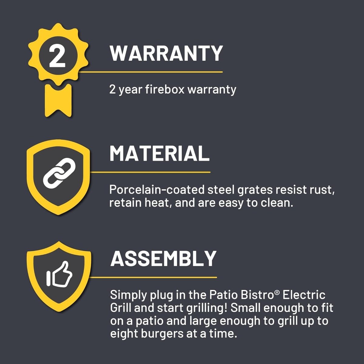 Plug in the Char-Broil® Patio Bistro® TRU-Infrared™ Electric Grill and start grilling without the hassle of gas or charcoal. Small enough to fit on your patio, this little grill is still big enough to grill up to 12 burgers. In fact, you can grill everything from steak to vegetables and dessert on the Patio Bistro. Invite your friends and family for dinner with the confidence that your food will be tender, juicy and delicious every time. If you want delicious grilled flavor without the hassle of gas or charcoal, you want the Patio Bistro TRU-Infrared Electric Grill.