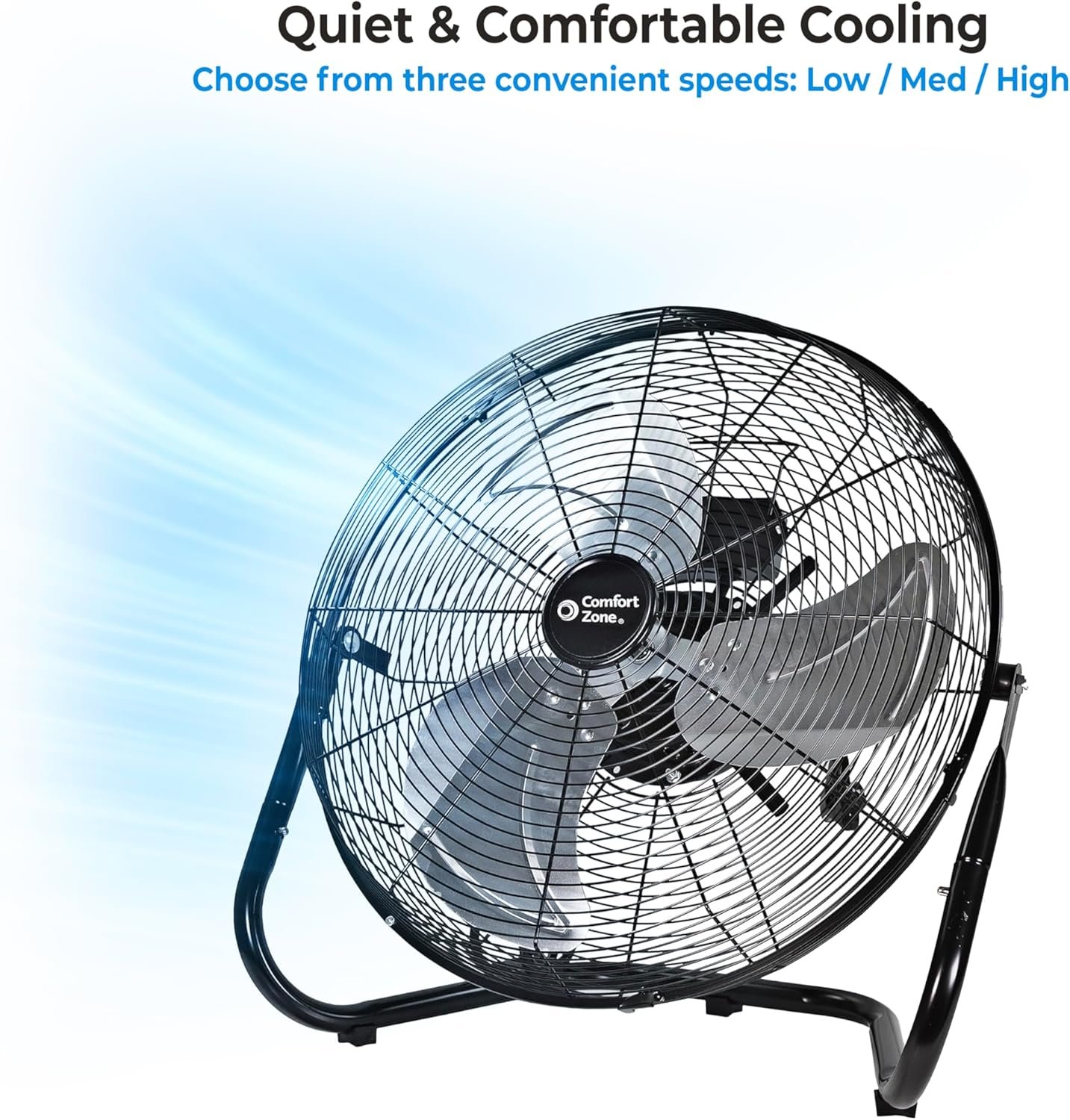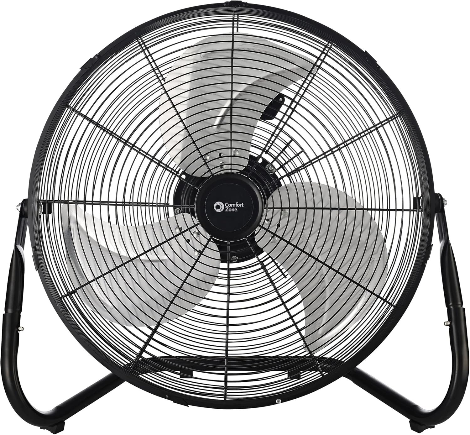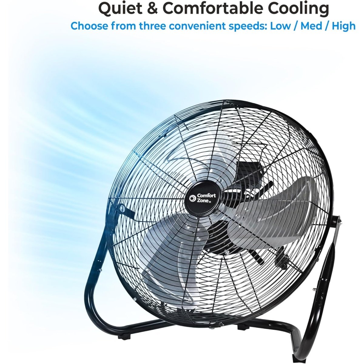 Powerful and Versatile Floor Fan – The Comfort Zone 3-speed high-velocity fan will help you keep large spaces comfortable to live and work in when it’s hot and humid outside. Great for everything from at-home use to public spaces like offices and restaurants, this 3-speed floor fan is easy to place anywhere you need it. Variable 3-Speed Output – The fan offers three different speed settings, making it easy to control the strength of the air output. Set it to low for a gentle breeze or shift it to high to get the air moving or give yourself a quick cool-down blast. A rotary control switch allows you to adjust the speed with a simple turn in either direction. Durable and Safe – The blades, stand and grill of the quiet office fan are all made from durable metal, which allows it to stand up to daily use for season after season. The sturdy design helps to ensure vibration-free performance, minimizing noise and distractions, and the tough metal grill helps to protect curious pets and children from the moving blades while it is in use. Directional Airflow – The quiet portable fan tilts 360 degrees, allowing you to direct the airflow exactly where you want it to go. This makes it a smart option for a wide variety of applications. Versatile Portable Design – A sturdy handle is built into the high-velocity metal fan to allow you to easily carry it from one area to another. This convenient design makes it a snap to move in and out of storage as the seasons change.