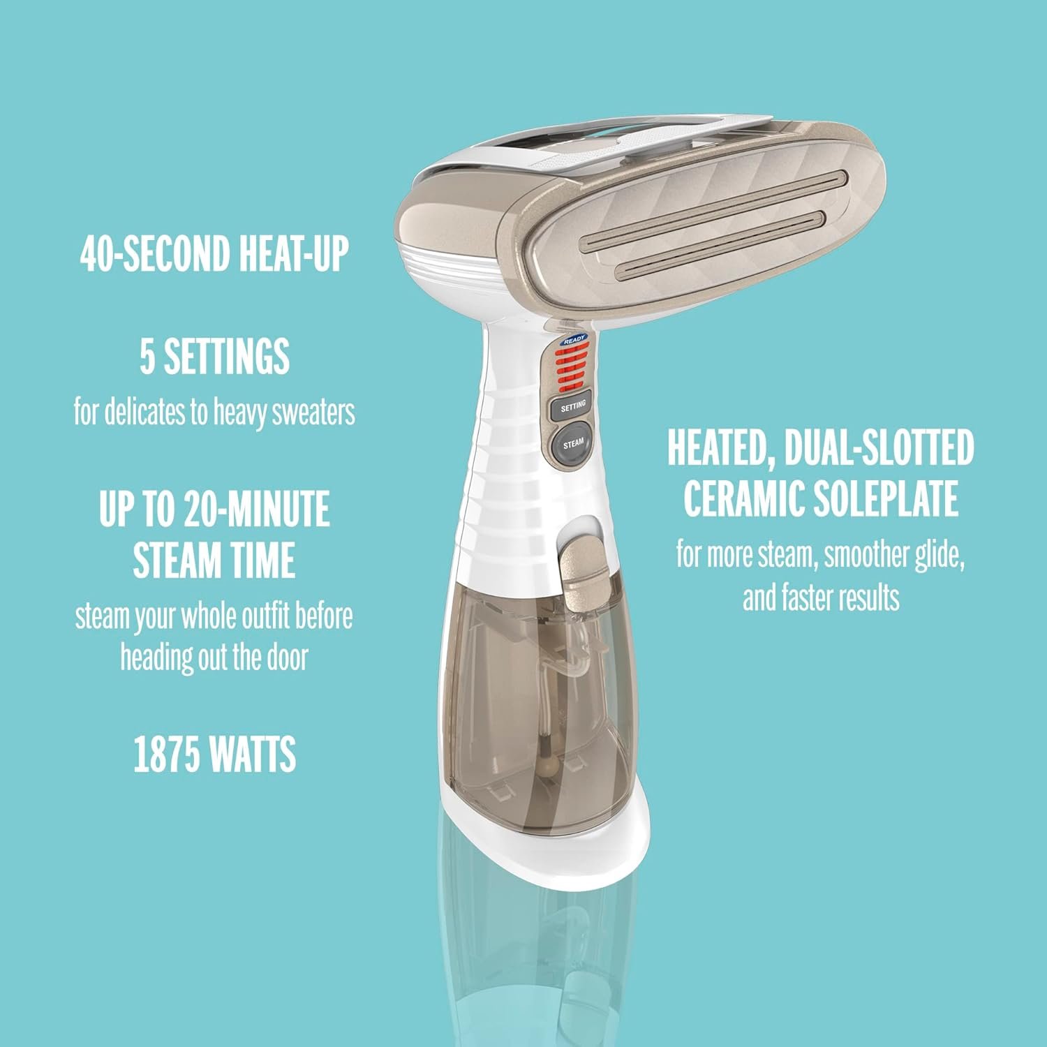 EASY TO USE: The Conair steamer for clothes features a 40-second heat-up and a 7.3 oz. water tank for up to 20 minutes of continuous steam. Quilted aluminum steamer plate and built-in creaser perform like an iron for a fresh-pressed look.