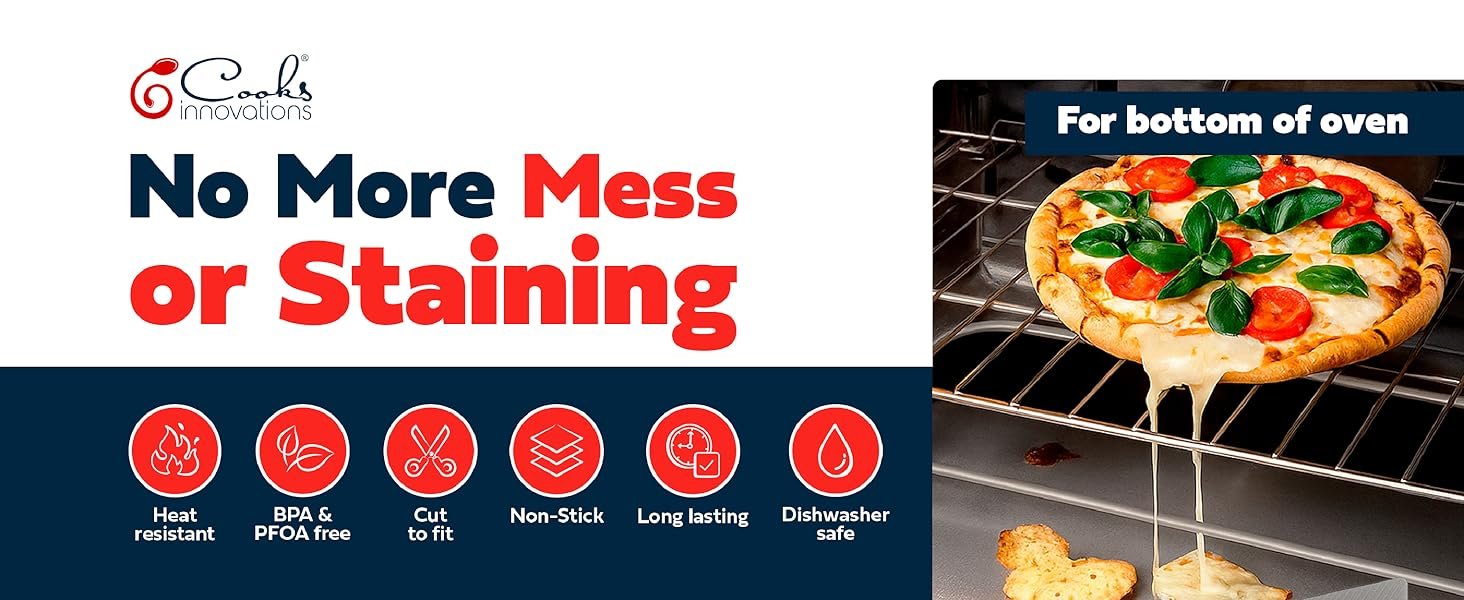• Heavy-duty, non-stick oven mat for bottom of oven – This 16.5″ x 23″ oven liner by Cooks Innovations can be trimmed for a perfect fit. A better alternative to aluminum foil, designed to withstand temperatures up to 500°F (260°C).