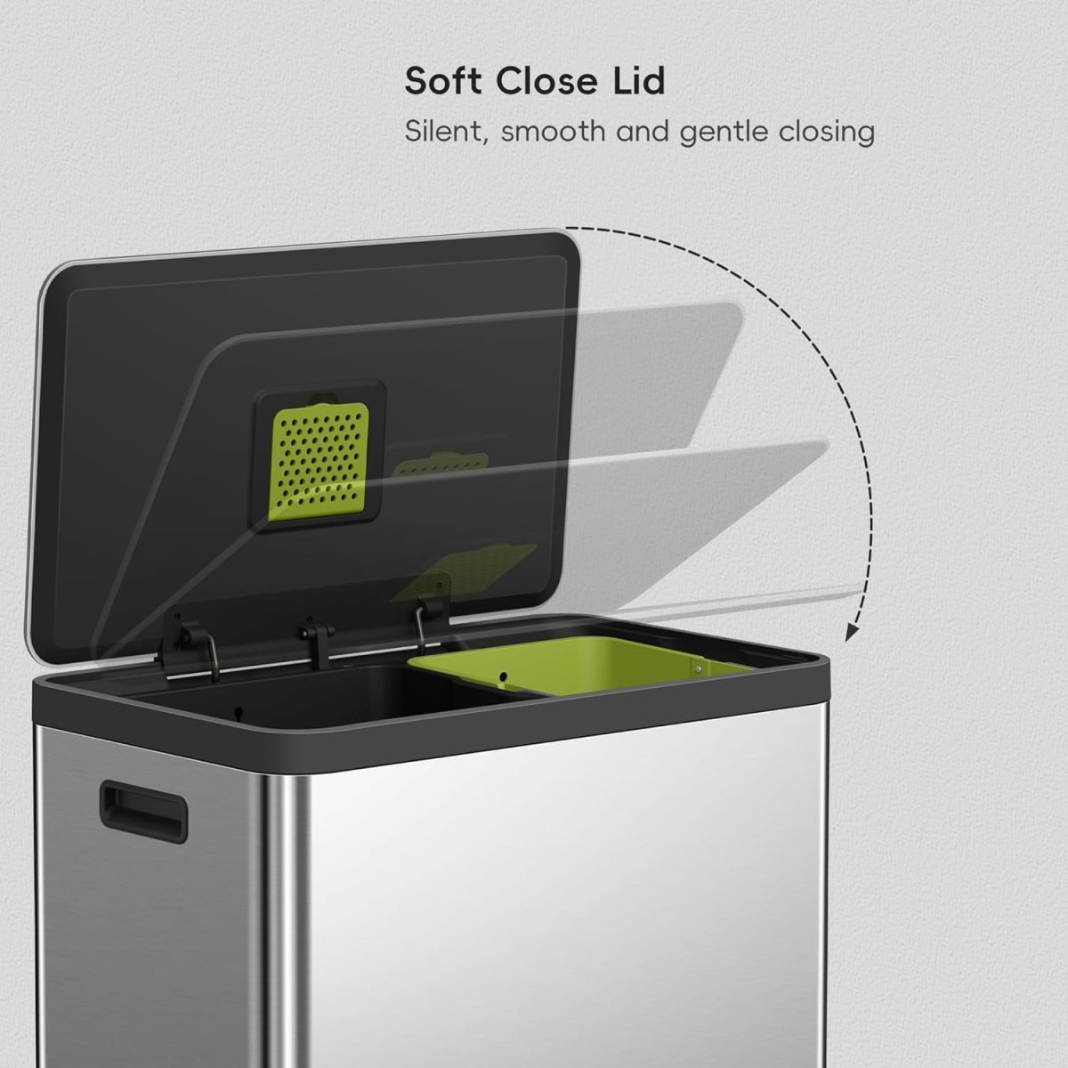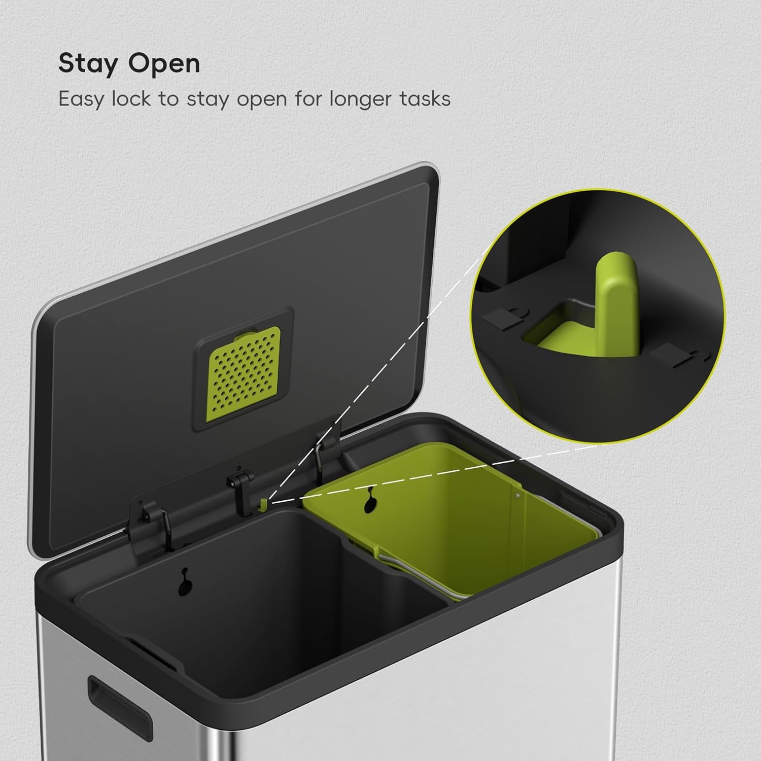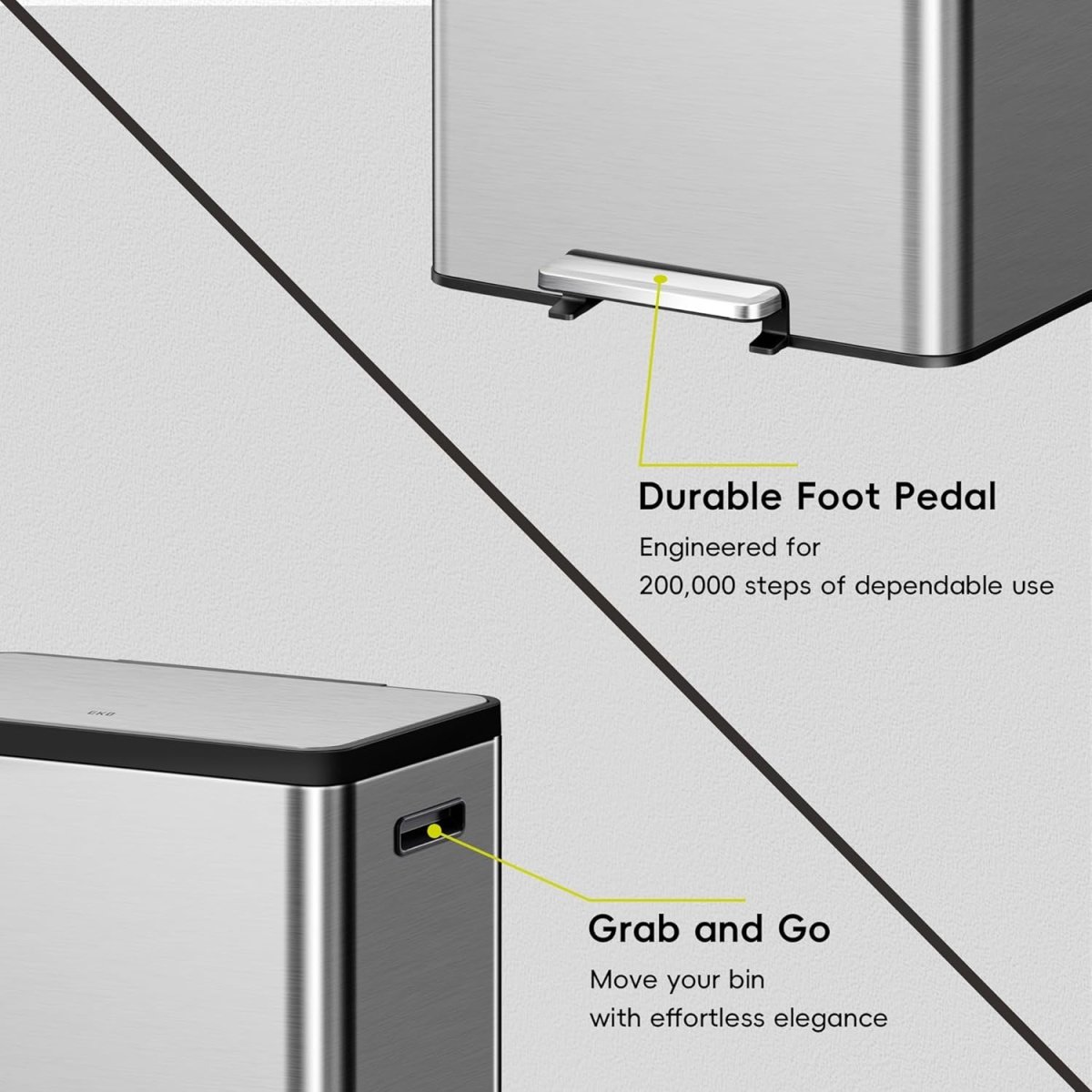 Dual Compartment Trash Can – Easily distinguish between waste and recyclables with 2 removable, color-coded inner buckets.