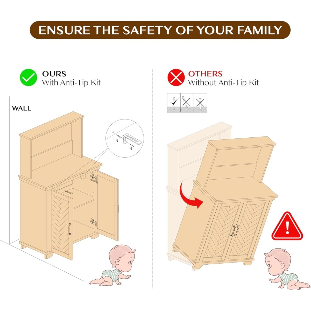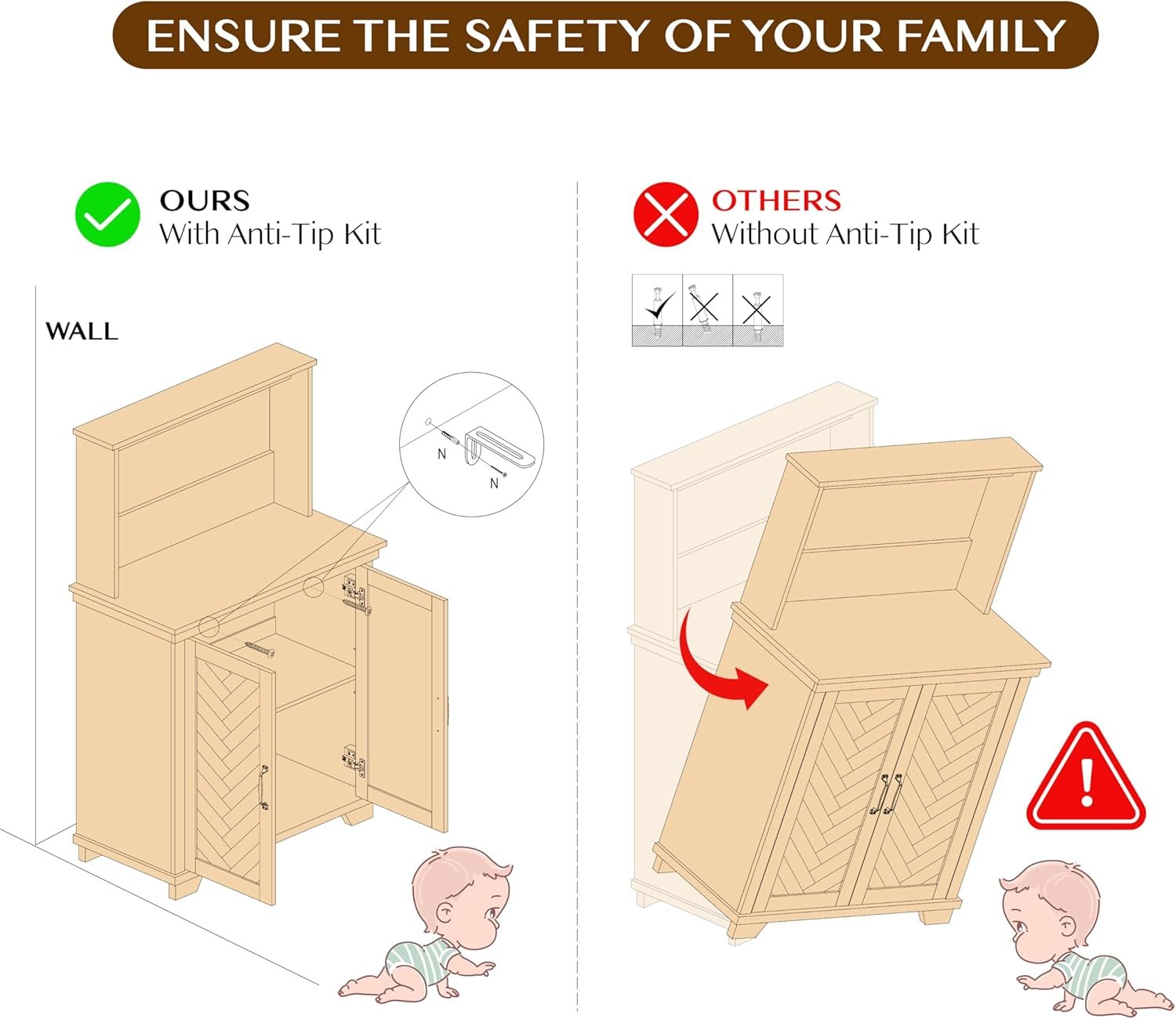 Sturdy and Strong:Crafted from high quality wood, the small corner coffee bar cabinet boasts is built to last with a robust construction. Its solid base ensures exceptional stability, supporting up to 100 lbs without compromise. The surface of the kitchen coffee bar cabinet is highly sturdy and scratch-resistant. For added safety, it incorporates an anti-tip design,offering peace of mind in any setting