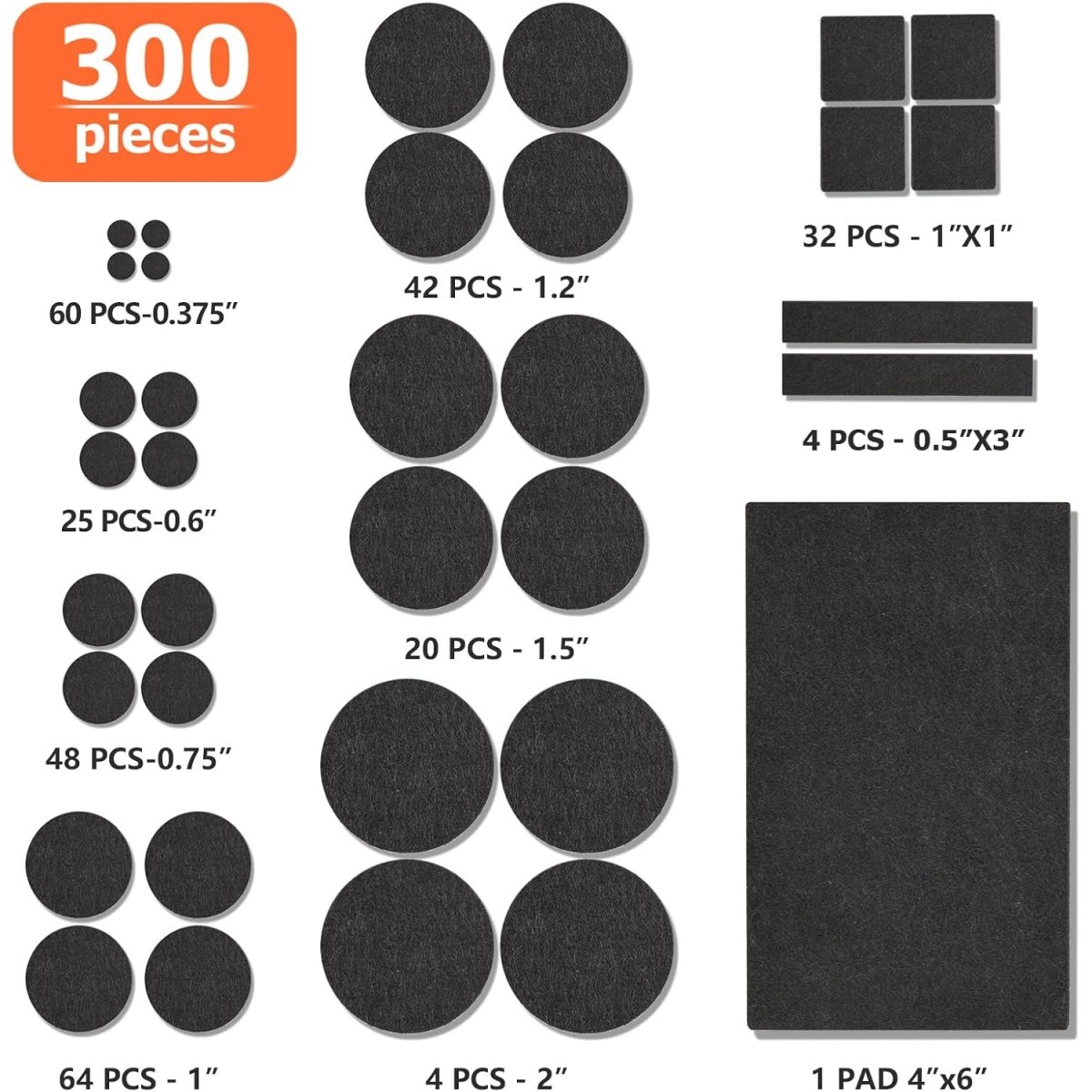 ❤️LARGE VARIETY PACK❤️ Our 300PCS Pack contains furniture pads of the 10 most useful sizes, round & square and in black: (60) 0.375″, (25) 0.6″, (48) 0.75″, (64) 1″, (42)1.2″, (20)1.5″,(4)2″,(32)1×1″, (4)0.5″x3″,and (1) 4″x6″. These should be more than enough coaster pads to protect all your floors from being damaged by ugly scratches.