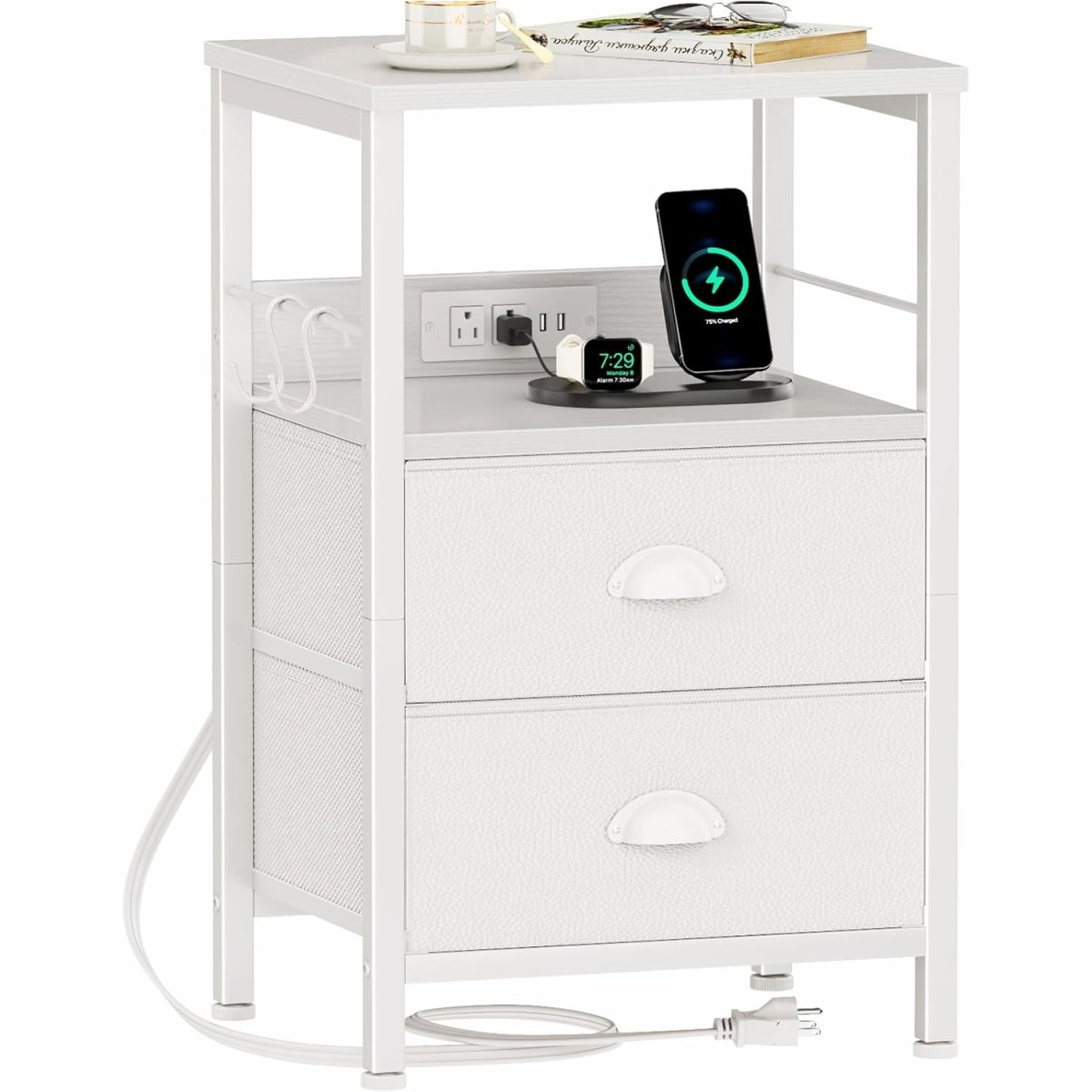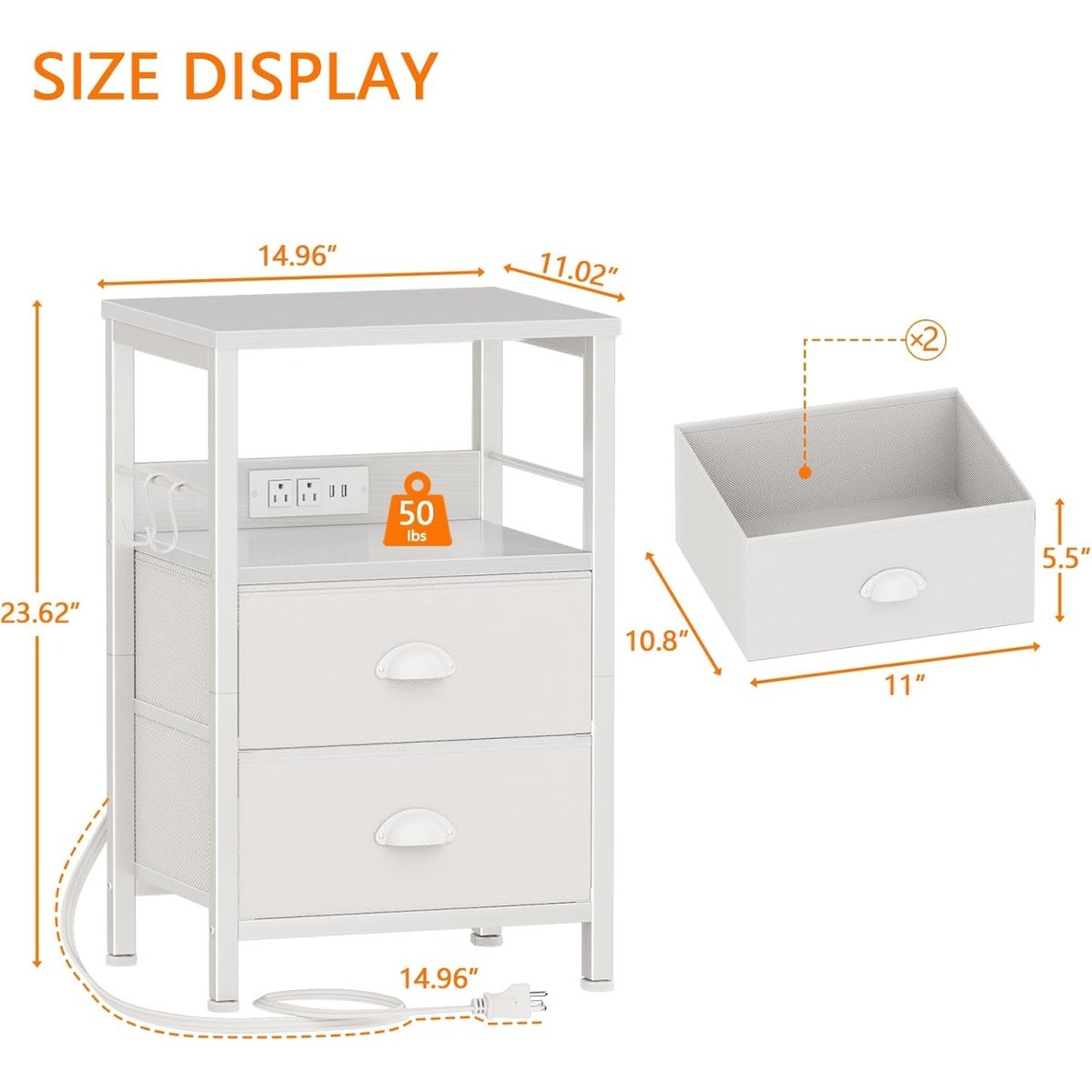 Nightstand with Charging Station: This white night stand comes with built-in 2 outlets and 2 USB ports, as well as a 4.9 foot power cord. Provide a convenient charging place for your mobile phone, Bluetooth earphones, watches, lamp and laptop, everything is within your arm’s reach.