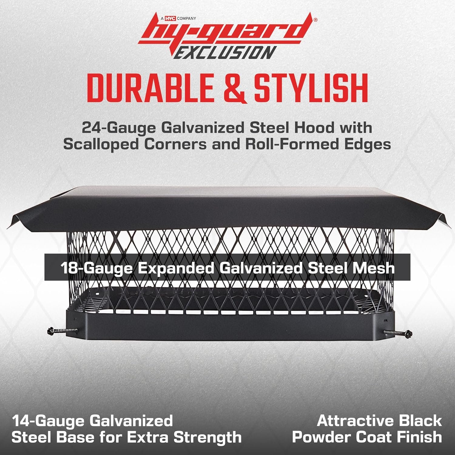 This HY-GUARD Galvanized Steel Chimney Cover is the durable and economic choice for chimneys. The outside mounting design provides maximum free air space and better draft while our durable powder coat finish stands up to the elements. It also helps protect internal metal fireplace fixtures and masonry chimneys from deterioration by keeping out rain, birds, animals, and debris. Made with a 24 gauge galvanized steel hood with scalloped corners, 18 gauge 3/4″ expanded galvanized steel mesh, 14 gauge galvanized steel base flanges and slotted hex-head bolts. 5-Year limited warranty. Made in the USA.