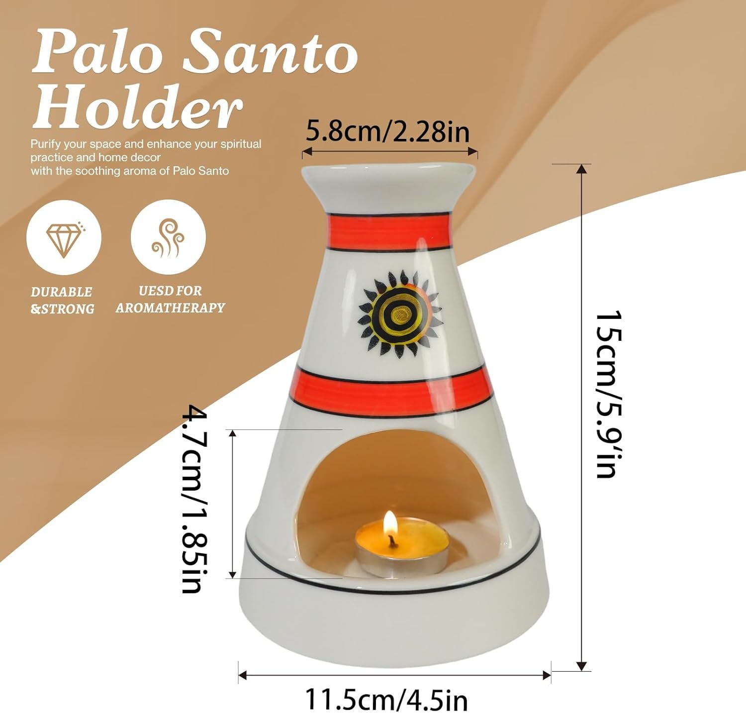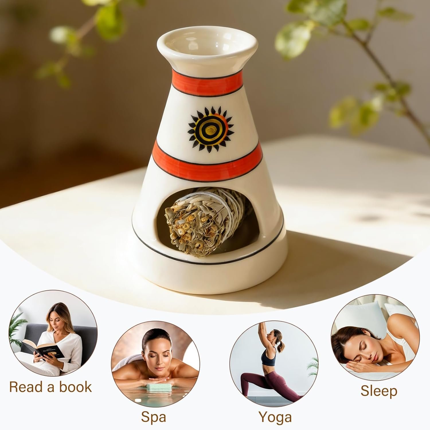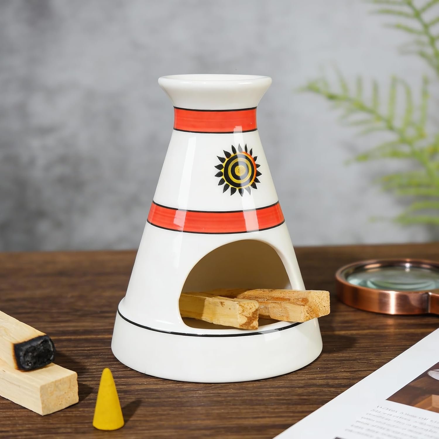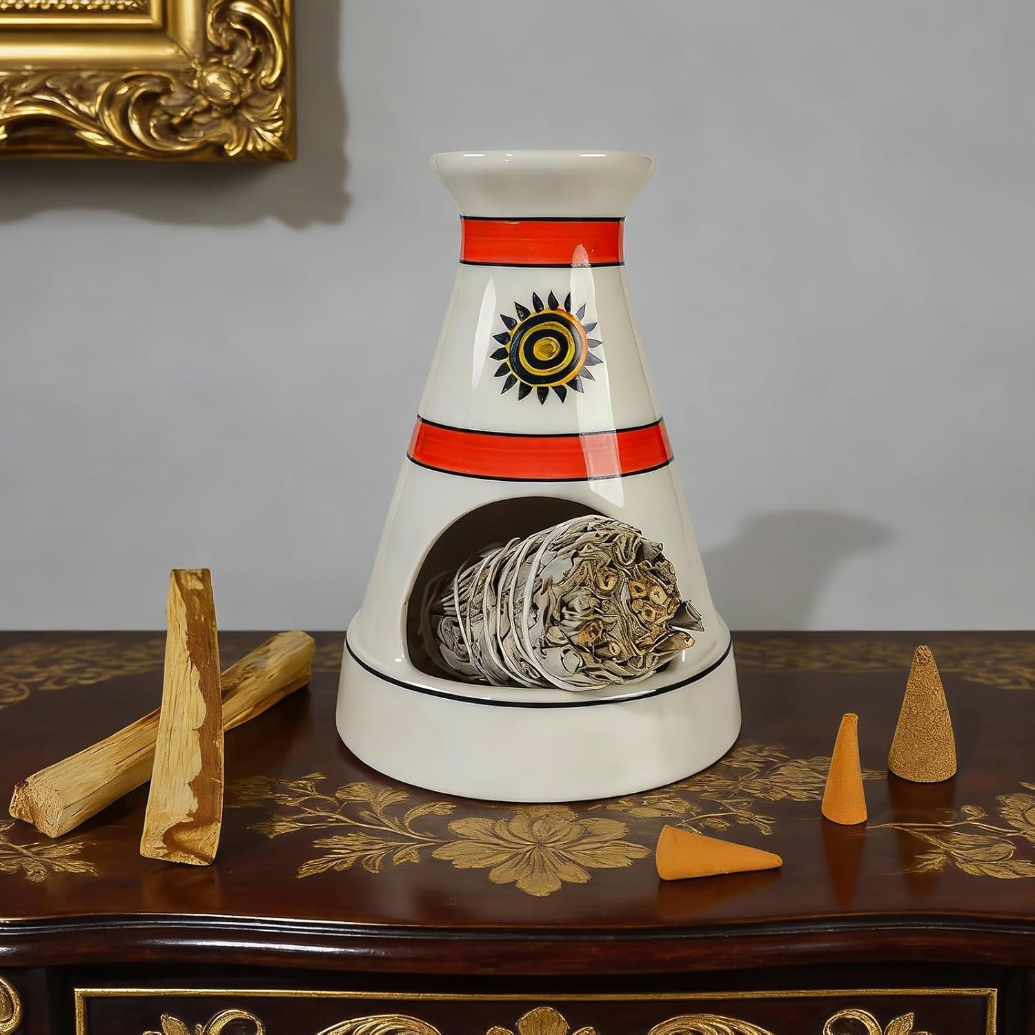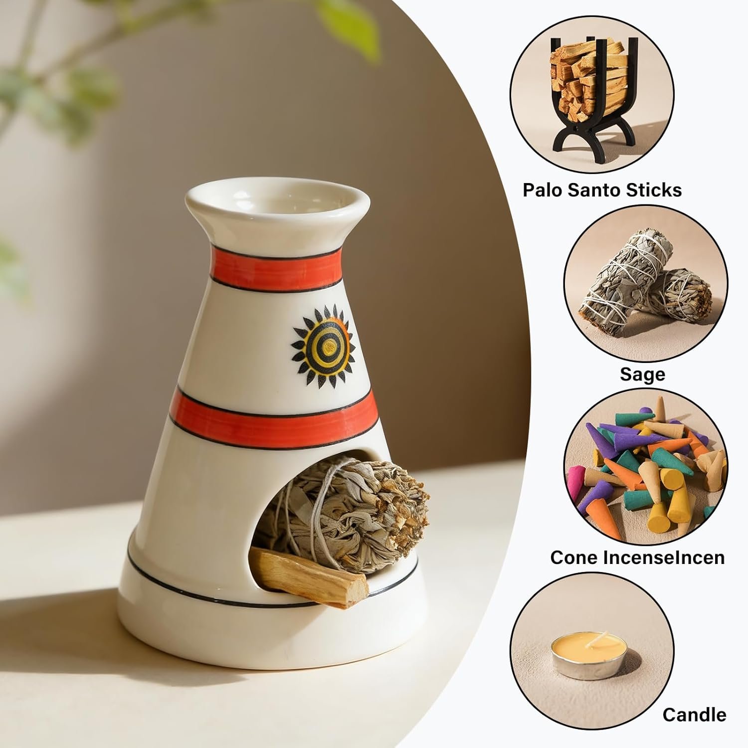 • Rustic Boho Decor with Cultural Charm:**Measuring 5.3” in diameter and 6.3” in height, this holder fits seamlessly into any home corner. Its white ceramic base, bold red accent stripes, and sacred sun totem complement boho, global-inspired, or zen decor styles—doubling as a striking decorative centerpiece that appeals to design lovers and ritual practitioners alike.
