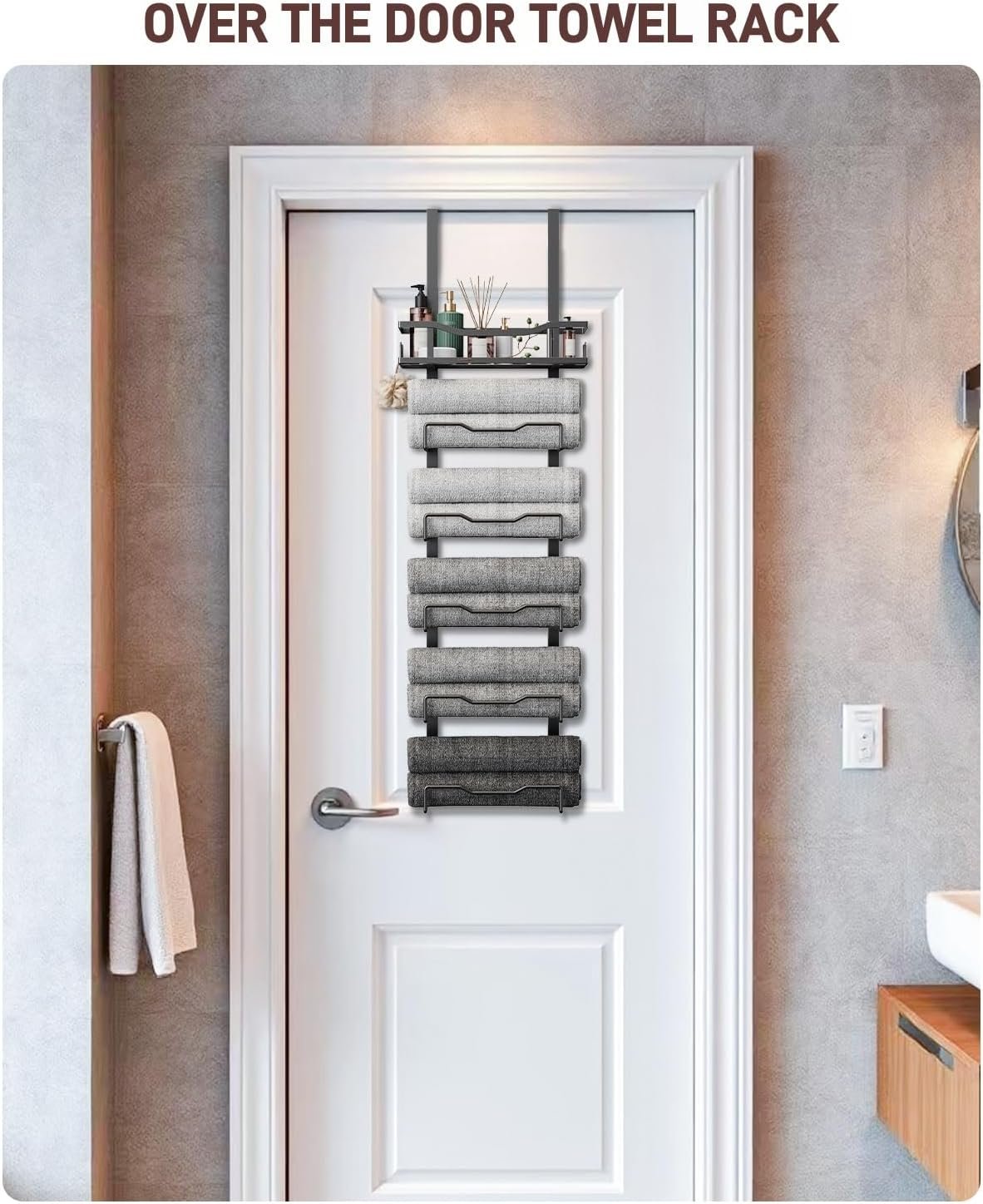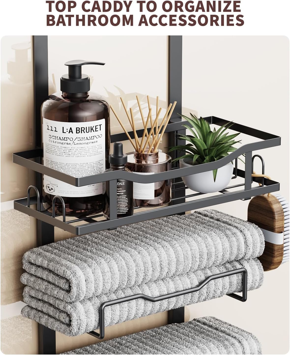 Space-Saving Towel Storage Solution: This vertical bathroom towel storage maximizes door space in small bathrooms, efficiently organizing towels for easy reach. The included top basket caddy is a great bonus to organize small bathroom accessories.