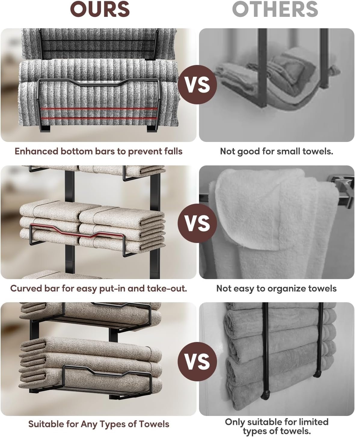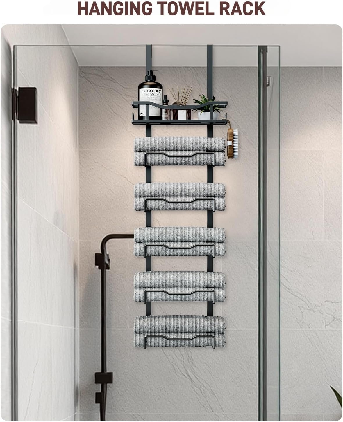 Simple Bathroom Decor: Made from durable metal featuring bottom bars on every tier to prevent towels from slipping off. The high-quality coating gives this towel holder for wall a sleek and aesthetic look. Our door towel hanger blends easily with your home decor.