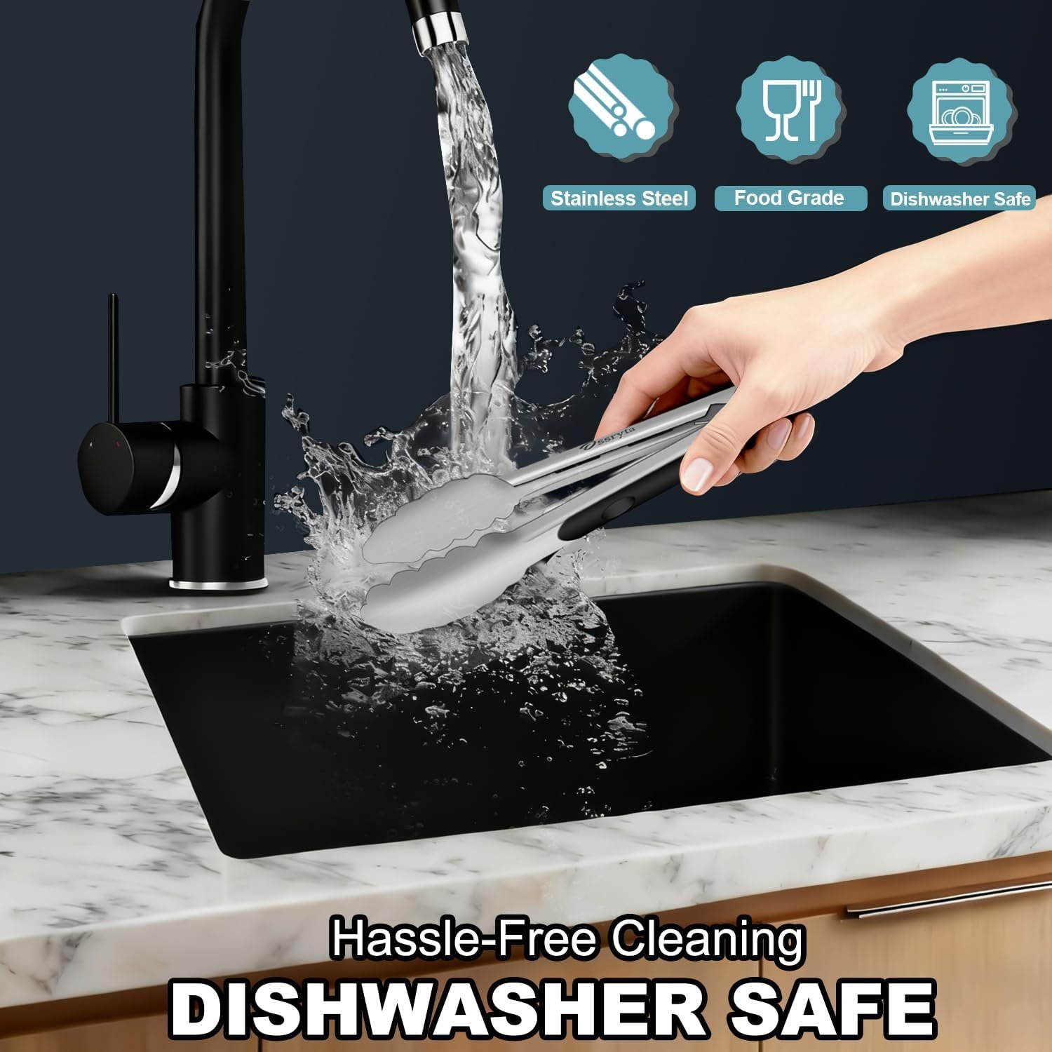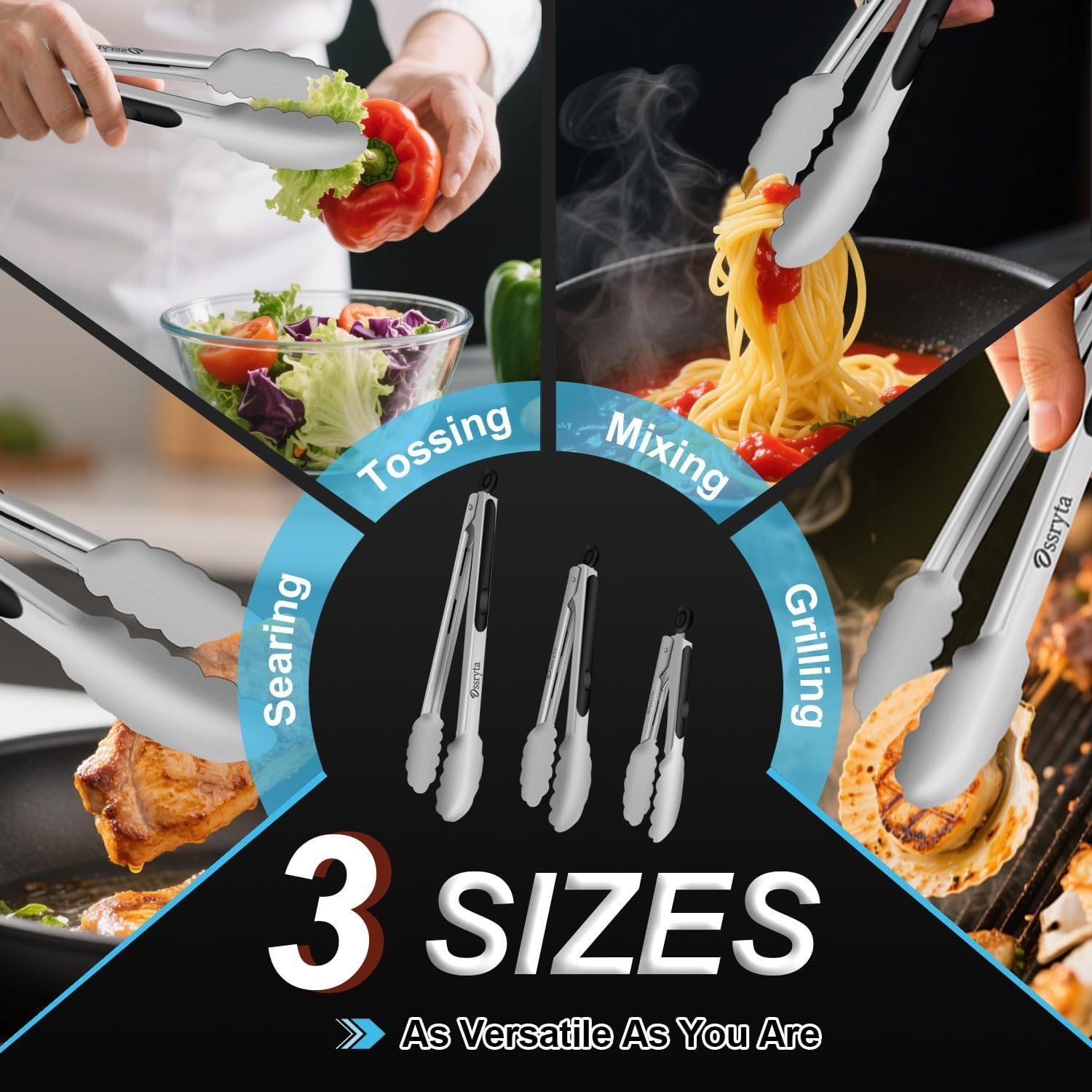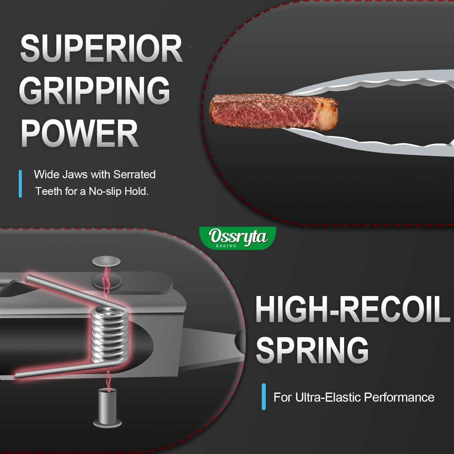 - MULTI-SIZE FOR EVERY KITCHEN TASK – Ossryta 3-piece tong set! The long 12″ tongs safely handle deep frying and grill flipping, while the 9″ version perfectly serves salads and pasta. For delicate tasks like plating desserts or grabbing toast, the compact 7″ tongs offer precision control. All sizes feature the same professional 600°F heat resistance – whether you’re searing steaks or tossing salads, you’re covered. Perfect as cooking tongs, grill tools, or for retrieving food from boiling water