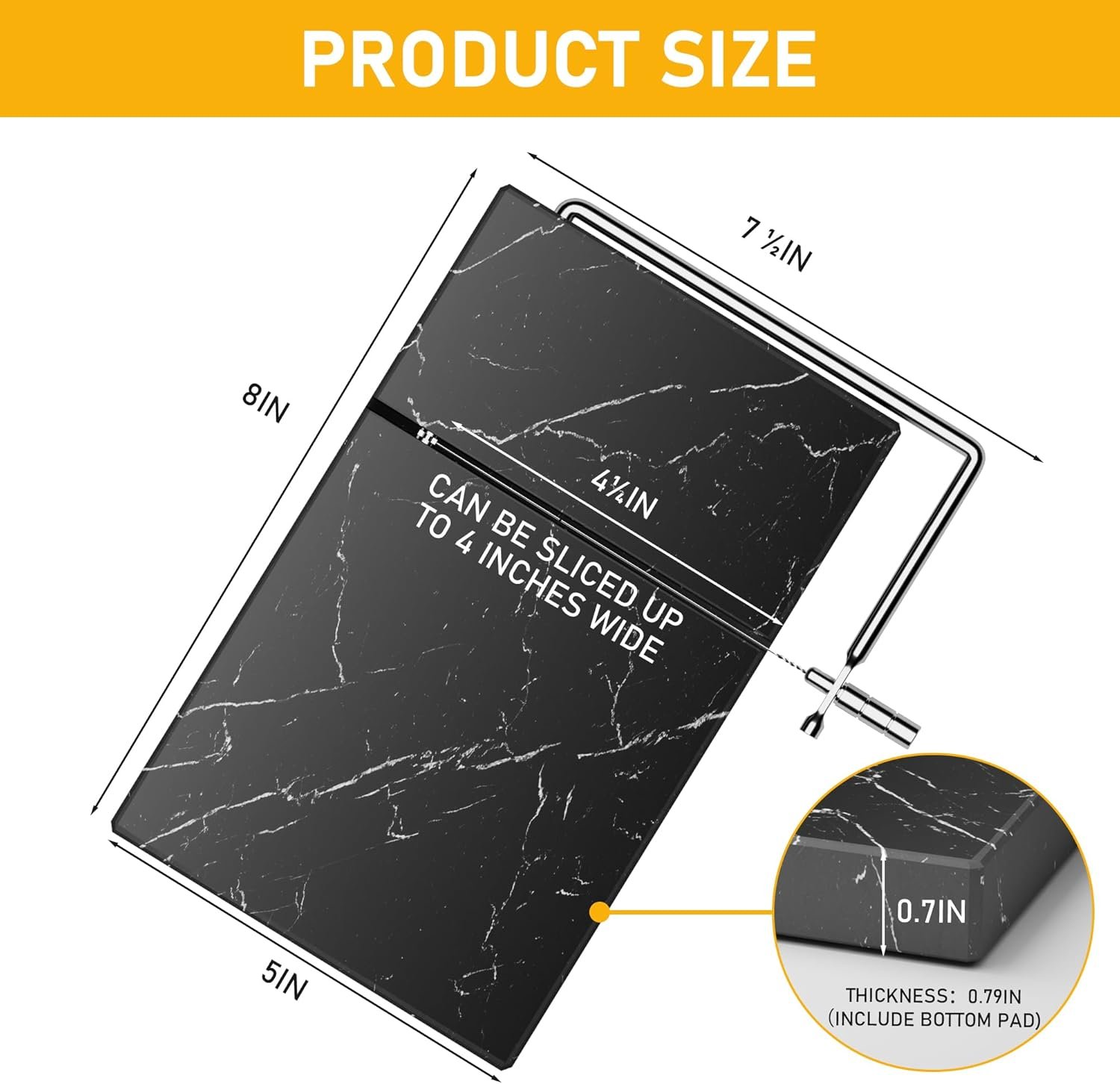 SLEEK AND STURDY DESIGN FOR EASY CHEESE CUTTING: Make slicing cheese a breeze with our stainless steel wire cheese slicer. The non-slip rubber feet keep it securely in place, while the sleek and durable design makes it an attractive addition to any kitchen. Simply wash the slicer and store in a dry, well-ventilated spot between uses for long-lasting functionality.