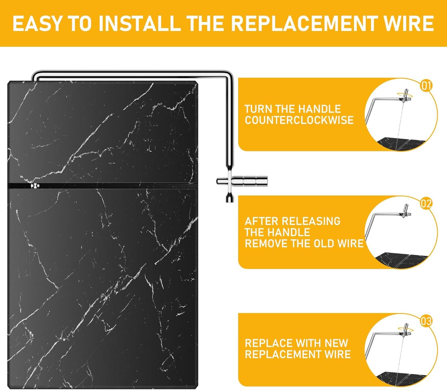 NO MORE WORRYING ABOUT BROKEN WIRES: Our Cheese Cutter comes with 5 thicker and stronger replacement wires to ensure you’re always ready to slice through cheese. With a preinstalled wire and the added spares, you’ll never have to worry about a broken wire again. The durable and reliable design makes it a must-have addition to your kitchen, for effortless and precise cutting every time.
