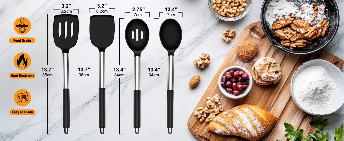 - 4Pcs silicone spatula and spoon set: These utensils are a game-changer in the kitchen!!! It includes Solid Spoon, Slotted Spoon, Slotted Turner, Solid Turner. Lightweight, flexible, and practical, these cooking utensils make cooking effortless, whether you’re a beginner or a seasoned home chef. Start creating delicious meals with professional-grade tools today
