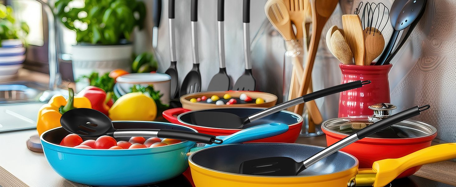 - Non-Stick Cookware Friendly: Love your non-stick pans? Treat them right! Our silicone cooking utensils set is the perfect match for non – stick cookware.They glide effortlessly across delicate surfaces, leaving no scratches behind. Like a trusted dance partner for your cookware, these tools move in perfect harmony with your pans, preserving their pristine surface meal after meal. Because great cooking starts with caring for your tools